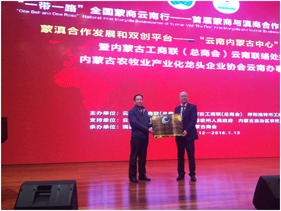 論壇上,蒙滇合作發(fā)展和雙創(chuàng)平臺——“云南內蒙古中心”建設啟動儀式暨內蒙古工商聯(總商會)云南聯絡處授牌、內蒙古農牧業(yè)產業(yè)化龍頭企業(yè)協會云南辦事處授牌儀式同期舉行。內蒙古農牧業(yè)廳黨組成員、總農藝師王雨峰授予云南省內蒙古商會“內蒙古農牧業(yè)產業(yè)化龍頭企業(yè)協會云南辦事處”的牌匾,內蒙古農牧業(yè)產業(yè)化龍頭企業(yè)協會執(zhí)行會長林永亮宣讀辦事處成立文件,由云南省內蒙古商會會長徐國林擔任辦事處主任。