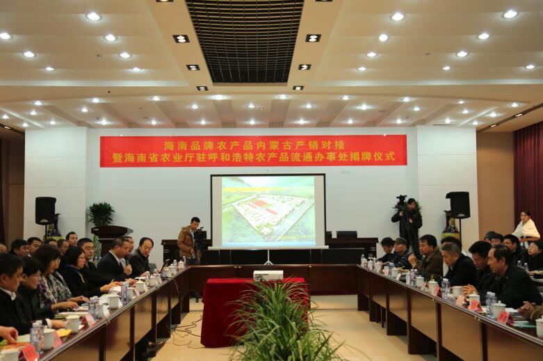115日,在自治區(qū)農(nóng)牧業(yè)廳、海南省農(nóng)業(yè)廳、自治區(qū)商務(wù)廳支持下,由內(nèi)蒙古農(nóng)牧業(yè)產(chǎn)業(yè)化龍頭企業(yè)協(xié)會、內(nèi)蒙古新蒙商聯(lián)合會、寶全現(xiàn)代農(nóng)貿(mào)物流園聯(lián)合主辦的海南品牌農(nóng)產(chǎn)品內(nèi)蒙古產(chǎn)銷對接暨海南省農(nóng)業(yè)廳駐呼和浩特農(nóng)產(chǎn)品流通辦事處揭牌儀式隆重舉行。內(nèi)蒙古農(nóng)牧業(yè)廳副巡視員孫曉文、海南省農(nóng)業(yè)廳副巡視員張健、內(nèi)蒙古農(nóng)牧業(yè)產(chǎn)業(yè)化龍頭企業(yè)協(xié)會副會長,蔬菜觀光分會會長陳勝禮、海南省內(nèi)蒙古商會會長,內(nèi)蒙古農(nóng)牧業(yè)產(chǎn)業(yè)化龍頭企業(yè)協(xié)會海南辦事處主任海靈光、寶全現(xiàn)代農(nóng)貿(mào)物流園總經(jīng)理白龍、內(nèi)蒙古新蒙商聯(lián)合會秘書長馬廣應(yīng)邀出席會議。海南省農(nóng)業(yè)廳、內(nèi)蒙古農(nóng)牧業(yè)廳各處室負(fù)責(zé)人以及海南省各市縣分管領(lǐng)導(dǎo)、兩省區(qū)相關(guān)龍頭企業(yè)代表、兩省區(qū)相關(guān)媒體代表100余人出席會議。