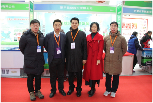 中國農(nóng)業(yè)產(chǎn)業(yè)化龍頭企業(yè)協(xié)會(huì)副秘書長(zhǎng)李現(xiàn)洲(中)與協(xié)會(huì)會(huì)長(zhǎng)閆樹春、常務(wù)秘書長(zhǎng)劉俊青在蒙羊牧業(yè)展位前合影
