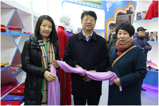 農(nóng)牧業(yè)廳產(chǎn)業(yè)化處處長(zhǎng)侯雁冰、副處長(zhǎng)郟金梅參觀羊絨展區(qū)
