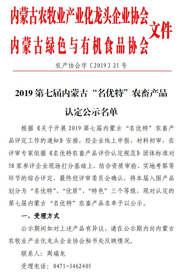 標(biāo)題:2019第七屆內(nèi)蒙古“名優(yōu)特”農(nóng)畜產(chǎn)品認(rèn)定公示名單