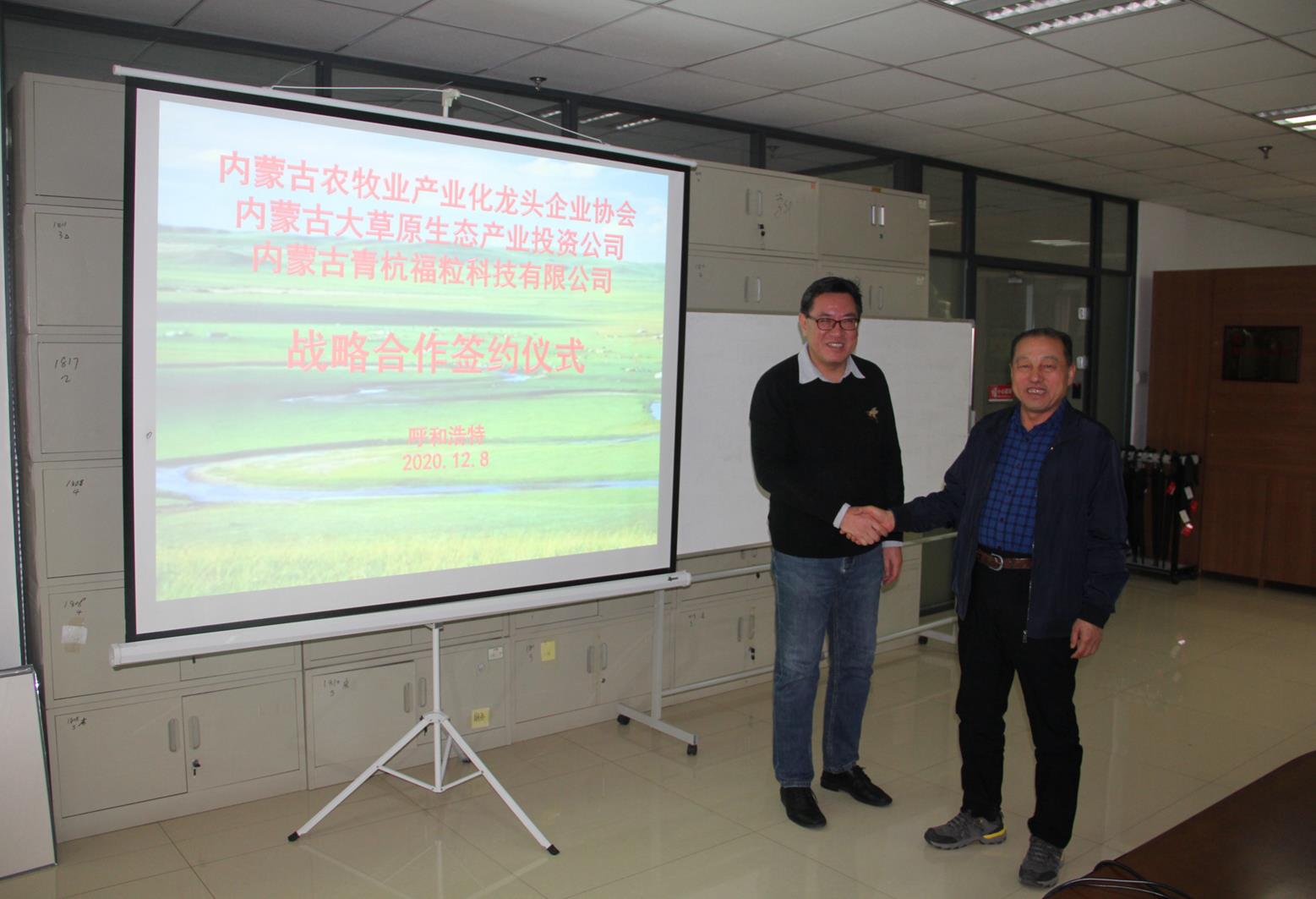 2020年12月8日,內(nèi)蒙古農(nóng)牧業(yè)產(chǎn)業(yè)化龍頭企業(yè)協(xié)會執(zhí)行會長林永亮一行到內(nèi)蒙古青杭福??萍加邢薰窘涣骺疾欤⑴c大草原生態(tài)產(chǎn)業(yè)投資有限公司董事長李剛簽署戰(zhàn)略合作協(xié)議。