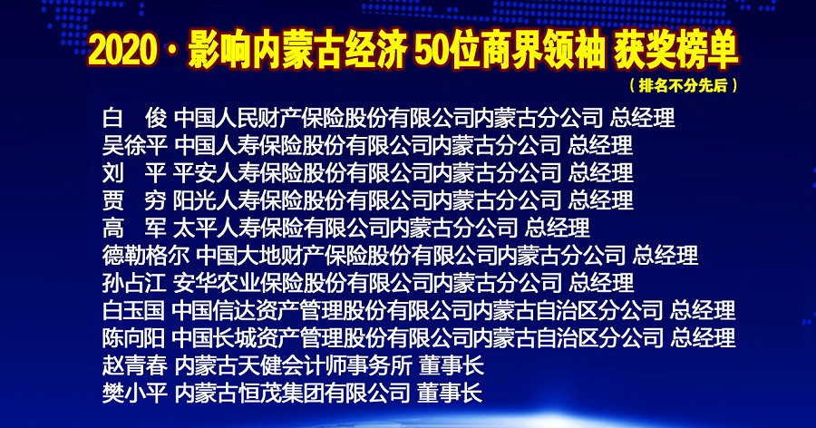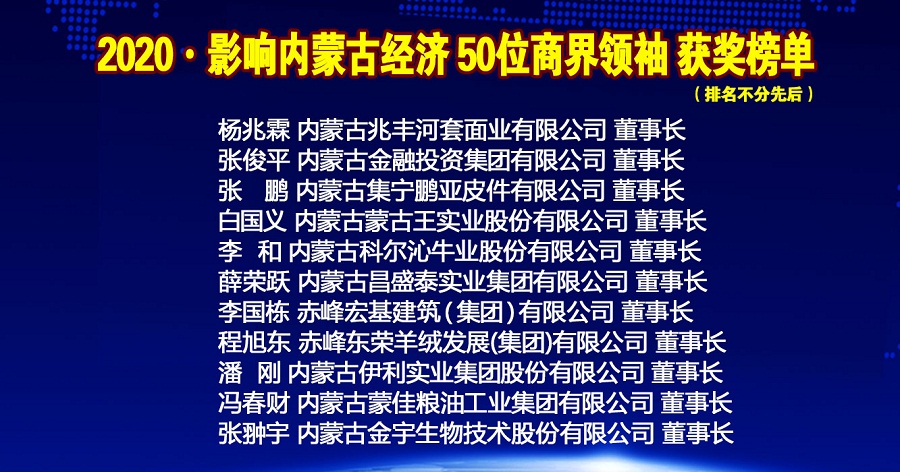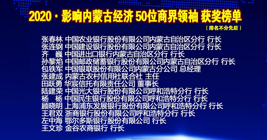 年會上內(nèi)蒙古金融網(wǎng)、內(nèi)蒙古新金融研究院隆重推出2020•影響內(nèi)蒙古經(jīng)濟(jì)50位商界領(lǐng)袖榜單,從2015年度開始,每年按照項目發(fā)展,甄選出當(dāng)年度引領(lǐng)商界風(fēng)潮的50位內(nèi)蒙古最具影響力的商界領(lǐng)袖。