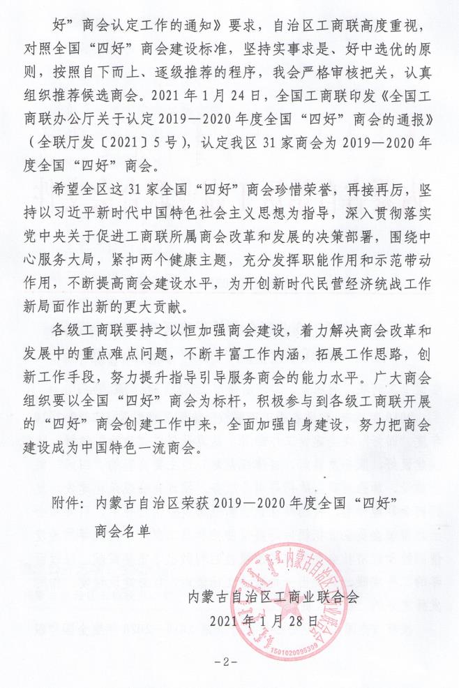 工商聯(lián)所屬商會(huì)是做好民營經(jīng)濟(jì)統(tǒng)戰(zhàn)工作的重要組織依托。為深入推進(jìn)工商聯(lián)所屬商會(huì)改革發(fā)展,持續(xù)深化“四好”商會(huì)建設(shè),全國工商聯(lián)組織開展了20192020年度全國“四好”商會(huì)認(rèn)定工作,經(jīng)過嚴(yán)格的推薦、初審以及專家評(píng)審組評(píng)審等環(huán)節(jié),日前認(rèn)定了1478家全國“四好”商會(huì)。內(nèi)蒙古農(nóng)牧業(yè)產(chǎn)業(yè)化龍頭企業(yè)協(xié)會(huì)榮獲全國“四好”商會(huì)榮譽(yù)稱號(hào)。