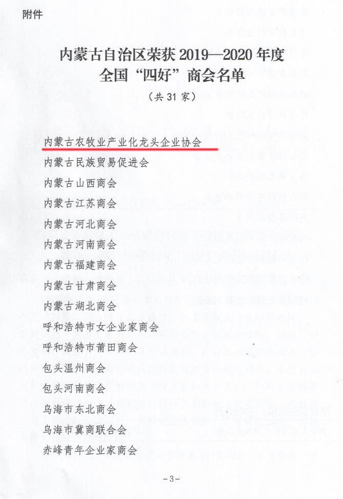 標(biāo)題:喜報(bào)!內(nèi)蒙古農(nóng)牧業(yè)產(chǎn)業(yè)化龍頭企業(yè)協(xié)會(huì)榮獲全國“四好”商會(huì)榮譽(yù)稱號(hào)