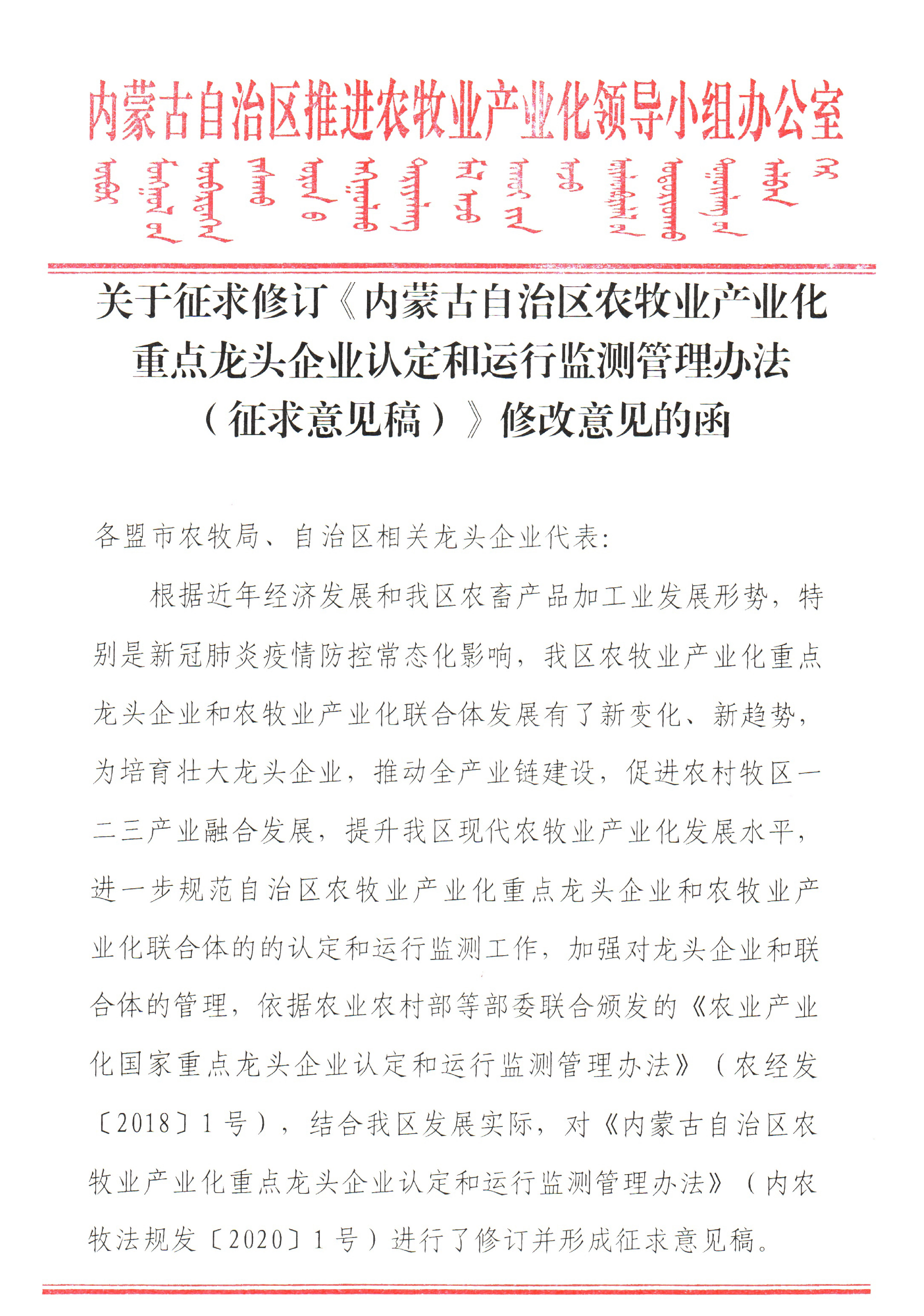 標(biāo)題:關(guān)于征求修訂《內(nèi)蒙古自治區(qū)農(nóng)牧業(yè)產(chǎn)業(yè)化重點(diǎn)龍頭企業(yè)認(rèn)定和運(yùn)行監(jiān)測(cè)管理辦法(征求意見(jiàn)稿)》修改意見(jiàn)的函