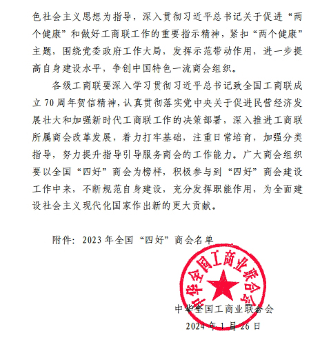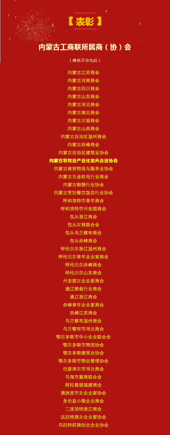 近日,中華全國工商業(yè)聯(lián)合會發(fā)布《關(guān)于認(rèn)定2023全國“四好”商會的通報》,通報指出,按照全國“四好”商會建設(shè)標(biāo)準(zhǔn),通過自下而上逐級推薦、省級工商聯(lián)審核把關(guān)和全國工商聯(lián)組織審定,認(rèn)定全聯(lián)1798家商會為2023年全國“四好”商會。其中內(nèi)蒙古自治區(qū)45家商(協(xié))會獲此殊榮,內(nèi)蒙古農(nóng)牧業(yè)產(chǎn)業(yè)化龍頭企業(yè)協(xié)會榜上有名!在此,謹(jǐn)向關(guān)心、支持協(xié)會的各位同仁表示衷心的感謝!同時,對獲此殊榮的各兄弟商協(xié)會表示熱烈祝賀!