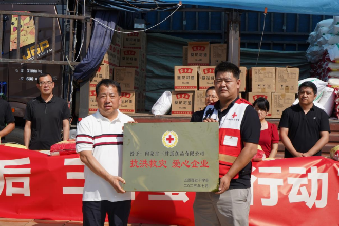 風(fēng)雨突襲巴彥淖爾時(shí),內(nèi)蒙古農(nóng)牧業(yè)產(chǎn)業(yè)化龍頭企業(yè)協(xié)會(huì)會(huì)長(zhǎng)單位巴彥淖爾市三胖蛋食品有限公司與家鄉(xiāng)共赴暖陽(yáng),8月1日,三胖蛋公司開展“一戶不落”精準(zhǔn)捐贈(zèng)活動(dòng),為套海鎮(zhèn)和平村436戶受災(zāi)村民送去價(jià)值15萬(wàn)元的米、面、油等生活物資。這個(gè)從河套平原走向全國(guó)的品牌,用行動(dòng)詮釋著”家鄉(xiāng)人永遠(yuǎn)和家鄉(xiāng)人站在一起“的質(zhì)樸承諾。