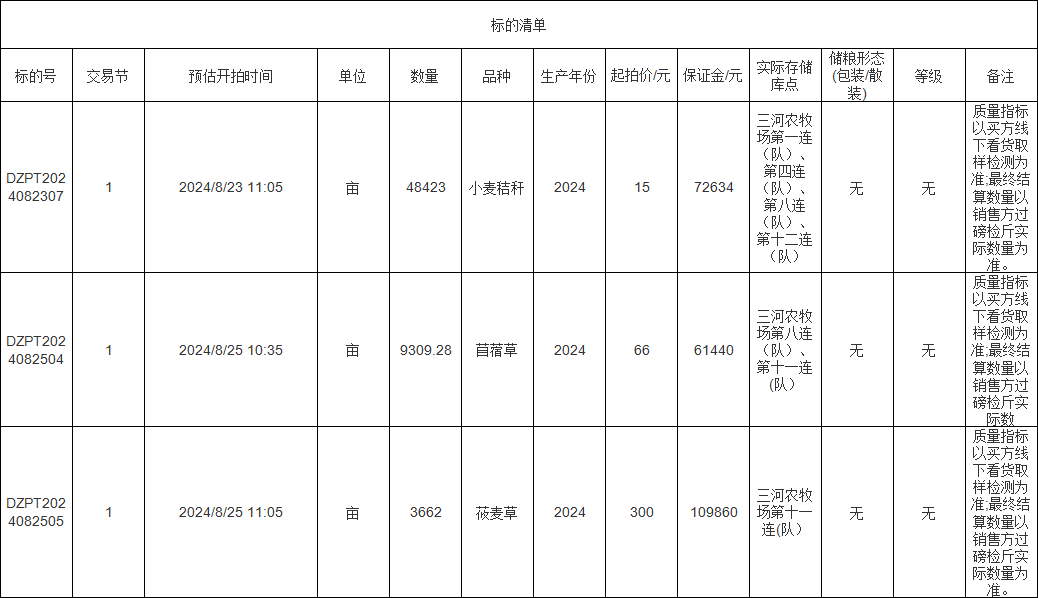 轉(zhuǎn)讓標的為苜蓿草、莜麥草、小麥秸稈,涉及面積苜蓿草9309.28畝、莜麥草3662畝、小麥秸稈48423畝,意向受讓方在競標前應自行對標的預估數(shù)量和質(zhì)量情況進行充分了解,交易標的均以實際狀況為準。標的存放地位于三河農(nóng)牧場,詳情見標的清單: