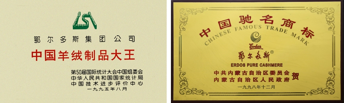 △左:1995年鄂爾多斯集團(tuán)榮獲“中國(guó)羊絨制品大王”稱號(hào);右:1998年,鄂爾多斯品牌榮獲“中國(guó)馳名商標(biāo)”榮譽(yù)。