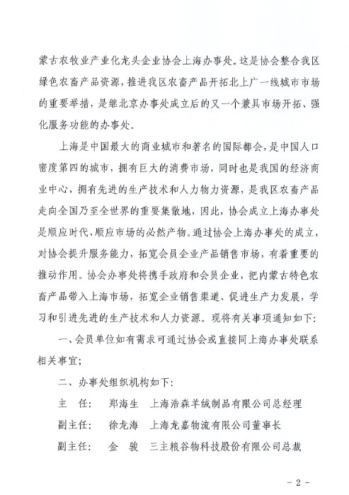 關(guān)于內(nèi)蒙古農(nóng)牧業(yè)產(chǎn)業(yè)化龍頭企業(yè)協(xié)會成立上海辦事處的通知