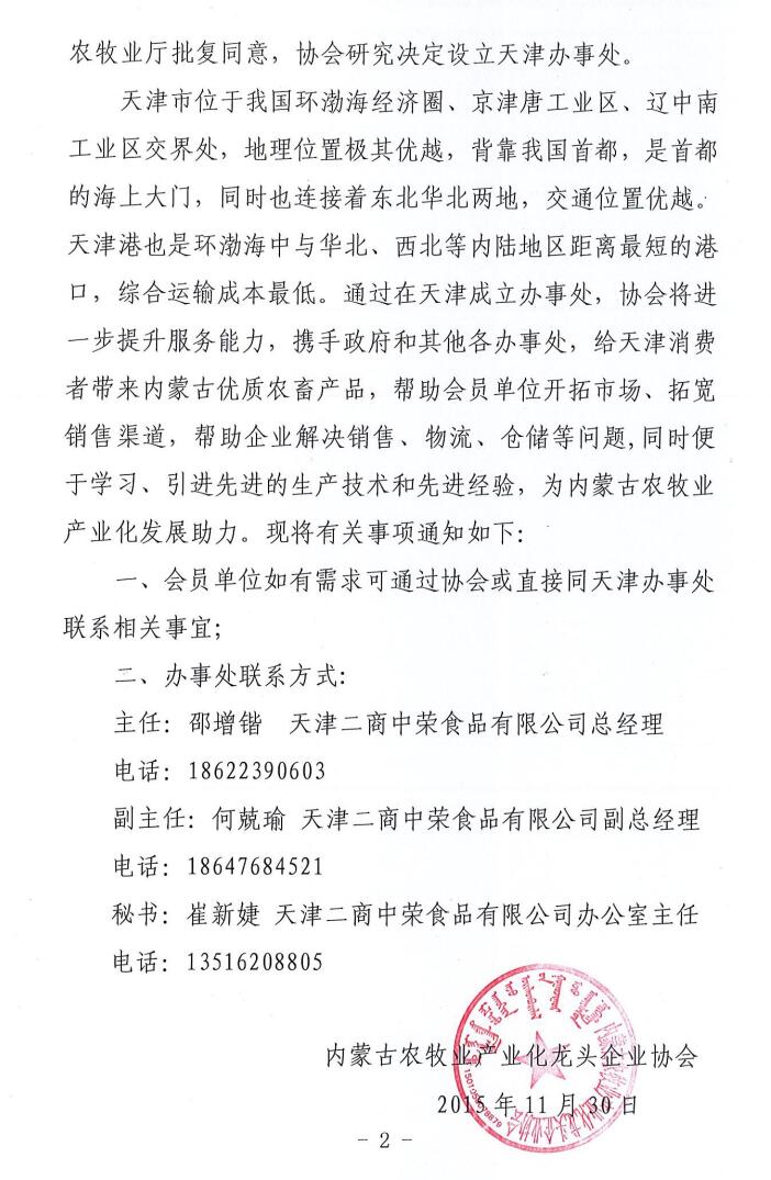 關(guān)于成立內(nèi)蒙古農(nóng)牧業(yè)產(chǎn)業(yè)化龍頭企業(yè)協(xié)會天津辦事處的通知