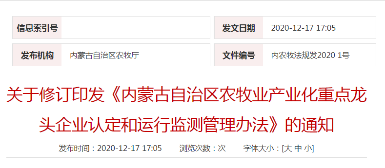 標題:關于修訂印發(fā)《內蒙古自治區(qū)農(nóng)牧業(yè)產(chǎn)業(yè)化重點龍頭企業(yè)認定和運行監(jiān)測管理辦法》的通知