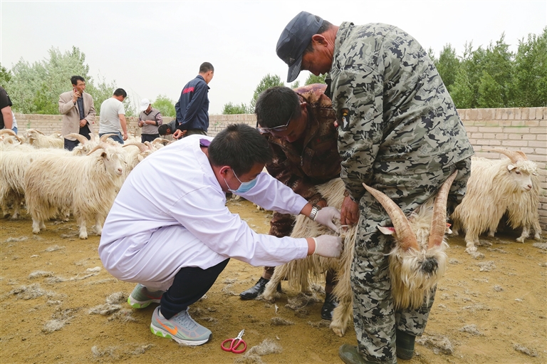 自治區(qū)纖維檢驗(yàn)局的技術(shù)人員在為鄂托克旗牧民選購(gòu)的阿爾巴斯種公羊做羊絨活體檢測(cè)。