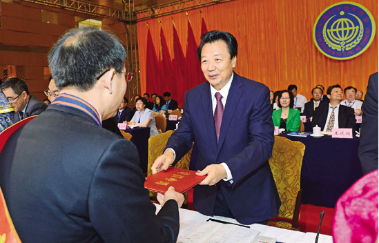 5月29日上午,自治區(qū)黨委書記王君在自治區(qū)科協(xié)第七次代表大會(huì)上,為榮獲“第九屆內(nèi)蒙古自治區(qū)青年科技獎(jiǎng)”和“首屆內(nèi)蒙古自治區(qū)科技標(biāo)兵”稱號(hào)的代表頒獎(jiǎng)。記者袁永紅攝