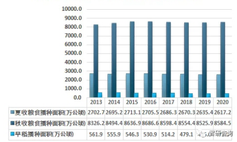 2020年全國糧食播種面積17.52億畝,比上年增加1056萬畝,增長0.6%;谷物播種面積14.69億畝,比上年增加176萬畝,增長0.1%;稻谷播種面積4.51億畝,比上年增加573萬畝,增長1.3%;豆類播種面積1.74億畝,比上年增加778萬畝,增長4.7%。受大豆振興計劃政策帶動,大豆播種面積1.48億畝,比上年增加825萬畝,增長5.9%。中國糧食生產(chǎn)再獲豐收,產(chǎn)量連續(xù)6年保持在1.3萬億斤以上,為扎實做好六穩(wěn)工作、全面落實六保任務(wù),為應(yīng)對復(fù)雜多變的國內(nèi)外環(huán)境、克服各種風(fēng)險挑戰(zhàn),為全面建成小康社會、打贏脫貧攻堅戰(zhàn)提供了堅實的基礎(chǔ)。(數(shù)據(jù)來源:國家統(tǒng)計局、中商產(chǎn)業(yè)研究院整理)